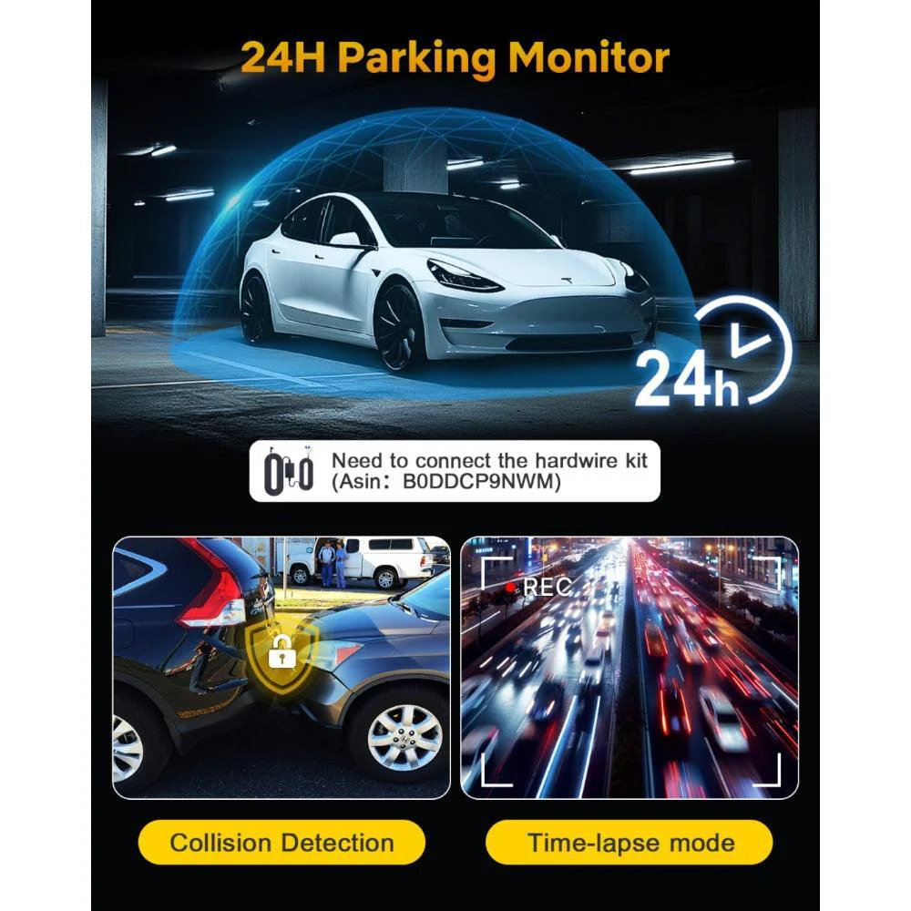La dashcam protège votre véhicule jour et nuit. Le mode parking avec capteur G active l’enregistrement dès qu’un choc est détecté. Le mode Time Lapse enregistre en continu pour une surveillance prolongée. (Attention : kit d’alimentation en option requis pour le monitoring parking.)