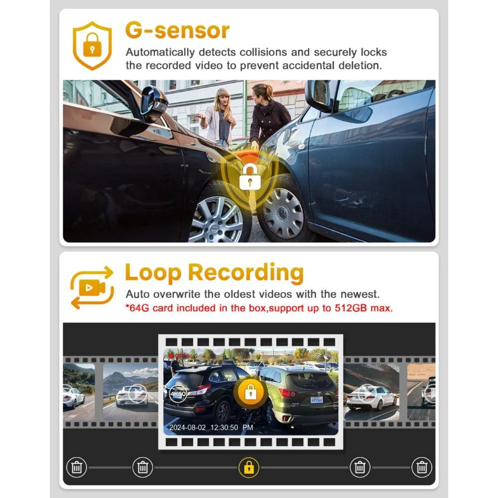 Profitez d’une résolution 4K à 60 images par seconde avec la caméra avant de la dashcam D900, idéale pour capturer les objets en mouvement rapide comme les plaques d’immatriculation avec une netteté exceptionnelle. Lorsque les deux caméras fonctionnent simultanément, enregistrez en 4K 30fps à l’avant et en 2,5K à l’arrière, bien supérieur aux caméras arrière 1080p classiques. Cette haute qualité vidéo garantit des images nettes et précises, parfaites pour des preuves d’accident.